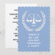 Invitations de la remise des diplômes de l'école de droit créative mettant en vedette des échelles de justice créatives et des citations d'avocat amusantes.