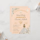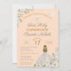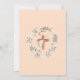 Belle première communion invitation florale avec des éléments rustiques, d'inspiration vintage avec fille en robe blanche traditionnelle, contre un arrière - plan de pêche doux. Au fond de l'invitation se trouve une croix de style boho avec fleurs d'aquarelle et verdure. Remplacez 'Première Communion sainte' par 'Christening' ou 'Baptême' selon ce qui convient à votre événement spécial.