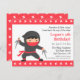 Pour les enfants qui aiment toute la façon ninja shinobi, ils vont adorer une fête d'anniversaire ninja avec des jeux autour des idées d'espionnage, d'infiltration et d'entraînement. Cette invitation est parfaite pour cette fête avec un mignon petit ninja en tenue gris et rouge. Il a une paire d'armes de poing dans les mains. Personnalisez facilement avec les détails de votre fête. Sur la page inverse est un shuriken ninja star motif en blanc et rouge.