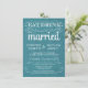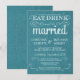 Mangez, buvez, et soyez mariés — invitations à des mariages campagnards rustiques de style Vintage — parchemins Tourbillonnant, bouclés et typographie à l'ancienne sur un arrière - plan tropical turquoise turquoise de burlap bleu océanique. Ajoutez vos noms et informations mariages dans ce modèle facile à utiliser. Élégant mais amusant et fantaisiste, l'écriture de script de style tableau de bord peut être modifiée pour votre thème rétro rétro ou formel mariage. Le style moderne Décontracté est parfait pour les mariages contemporains branchés avec une touche amusante de charme sophistiqué pour les mariés et mariés traditionnels. Veuillez nous contacter pour obtenir de l'aide sur la personnalisation si vous avez besoin d'espace supplémentaire pour vos détails mariages. Autres formats et styles de tableau de bord disponibles.