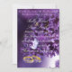 Parfait pour un mariage, échangeant ses voeux dans un cadeau d'amis. Cette carte tranquille est en violet. Et il y a une paire d'anneaux mariages en bas. Un texte blanc et un bel arrangement floral. Au fond, vous avez un endroit pour plus d'infos. Et un arrière - plan damassé en violet et blanc. Cette carte fera de n'importe quel mariage le mieux que l'on puisse se souvenir