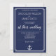 Invitations de mariage nautique avec cadre blanc, ancre blanche et texte blanc personnalisé, lorsque couple hôte avec leurs familles, imprimé sur arrière - plan bleu marine