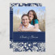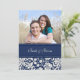 cartes photos personnalisés faire-part de mariage dans élégant bleu marine foncé et blanc cassé motif floral damask. Customisez ces invitations avec vos coordonnées de mariage et votre propre photo. Disponible en produits assortis pour tous vos besoins mariages.