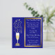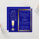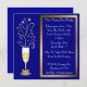 Les nouvelles années Ève élégantes de bleu et d'or party des invitations. Graphiques d'un verre de champagne, avec un arc goldtone sur la tige et les étincelles tirant hors du dessus du verre, sur un fond bleu. Une zone de texte encadrée goldtone du côté droit de l'invitation a le texte blanc personnalisable. Personnalisez pour dire que quelque chose que vous souhaitez. Grande invitation de regard pendant une soirée mémorable.