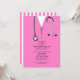 Invitations de la fête de remise des diplômes de l'école de médecine créative mettant en vedette des gommages d'hôpital rose et du stéthoscope. Modifiez le texte pour créer une invitation unique de la fête du médecin ou de la faire-part d'études de médecine.