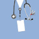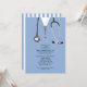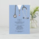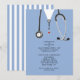 Invitations de la fête de remise des diplômes de l'école de médecine créative mettant en vedette des gommages d'hôpital bleu et du stéthoscope. Modifiez le texte pour créer une invitation unique de la fête du médecin ou de la faire-part d'études de médecine.