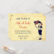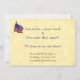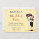 Un modèle d'invitation de fête du 4 juillet éditable avec une illustration vintage d'un garçon tenant un drapeau américain et des feux d'artifice et un espace pour votre adresse de retour au dos en lettres amusantes sur un fond de parchemin faux.