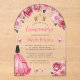 Cette jolie invitation de quinceañera comporte une bordure supérieure de roses roses roses qui surplombe une tiare d'or. Une fille aux cheveux foncés en robe de princesse rose et de petits papillons roses décorent le texte. Le mot "Quinceañera" et le nom de l'invité d'honneur apparaissent dans un élégant script d'écriture rose, avec le reste du texte en gris sans serif.