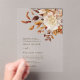 Aquarelle Rustique Automne Floral Mariage Acrylique Invitations. Notre Faire-part de mariage en acrylique d'automne présente un design transparent élégant qui ajoute une touche moderne et élégante à votre papeterie mariage d'automne. Cette magnifique invitation met en vedette des feuilles d'aquarelle peints à la main, orange, cuivre et terre cuite, ainsi que des dahlias crème et beige et de riches roses rouille et marron pour un look saisonnier saisonnier. Parfait pour un mariage de automne romantique, cette invitation donne le ton de votre journée spéciale. Explorez les éléments de coordination de notre collection de Mariages Romance d'automne pour une suite de mariages cohésifs.