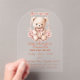 Quelle belle façon d'accueillir des invités invitations à une douche bébé fille. Une belle invitation acrylique avec des accents coordonnés roses et une jeune fille en peluche design ours à la tête. Le texte de l'ombre portée peut être ajusté ainsi que les couleurs du texte.