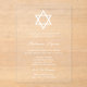 Invitations en acrylique transparent pour une élégante Bar Mitzvah. Cette invitation simple présente une police de caractères formelle et une étoile de David.