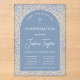 Une invitation de confirmation garçon bleue qui combine l'ancien et le nouveau : une arche bleue moderne sur un motif floral bleu vintage sur arrière - plan transparent. Dans la partie supérieure de l'arc il y a une croix avec du texte voûté au-dessus. Le nom est écrit en script. Les infos de cérémonie et de réception sont sur deux colonnes séparées par une ligne. Le texte et les lignes sont blancs, l'arrière - plan est un vintage Morris floral bleu du 19ème siècle motif : "Merton" de Kate Faulkner, de 1888, maintenant dans le domaine public.