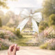 A clear, transparent background, decorated with a large ivory colored bow with pearls and a golden cross. Personalize and add a name and details details.