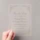 Cet élégant mariage formel d'inspiration vintage, à l'exception de la carte de date, présente le texte en écriture dorée et les polices serif, encadrées par un délicat motif vintage de vigne dorée, sur un arrière - plan transparent clair.