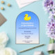 Faites un petit plongeon avec cette charmante invitation d'anniversaire de canard en caoutchouc jaune, idéale pour les fêtes d'enfants sur le thème de l'eau ! La carte acrylique en forme d'arc présente un canard en jouet doux flottant sur un beau dégradé bleu avec un fond de sable pour un look plage et ludique. Personnalisez-le sans effort avec les détails de votre événement pour une fête amusante et inoubliable.