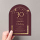 Celestial Red Gold Sun Moon Astronomy 30e anniversaire Acrylique Invitations dispose d'un élégant soleil doré, lune et étoiles avec un cadre doré sur un arrière - plan rose profond. A l'intérieur, vous avez vos informations d'invitation personnalisées pour le trentième anniversaire. Personnalisez en modifiant le texte dans les zones de texte. Conçu pour vous par Evco Studio www.zazzle.com/store/evcostudio