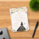 Cette invitation à la fête d'anniversaire élégante et glamour présente une belle princesse aux cheveux foncés et à la peau foncée dans une robe de bal noire. Le texte combine écriture manuscrite et polices sans serif modernes pour un look élégant et sophistiqué. Les compositions florales, les papillons et les confettis d'or créent un mélange parfait de rustique et de chic. Graphiques par www.etsy.com/uk/shop/SunflowerDayLove