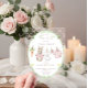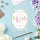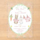 This unique transparent invitation features a custom hand-painted frame of a crisp pink ribbon pattern accented with a lush light green ribbon wreath, creating a clean, classic, and welcoming look. A sweet watercolor clothesline is strung across the center, proudly displaying tiny, adorable items, each featuring a cute pink clothed bunny. The scene is completed with cute fresh carrots, and bright, cheerful daffodils, all rendered in a soft watercolor style. Easily add your own details and change the font style, size color and placement if you would like to. This invitation is a beautiful keepsake, inviting your guests to share in the "hoppy" anticipation of your baby girls's arrival!