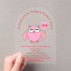 Cette superbe Faire-part de mariage acrylique présente un dessin mignon d'une chouette rose avec des yeux endormis, un petit bec et de mignons petits pieds. Le hibou tient un ballon rose bubblegum. Il y a un texte rouge vif à l'intérieur du ballon qui dit, "Aimez-vous". Il y a du texte personnalisé pour que vous puissiez inclure les noms du couple heureux et tous les détails Mariages importants.
