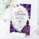 Purple gold Quinceanera celebration acrylic invitation. Features brunette girl in ball gown dress, script font, gold butterflies, roses and tiara. Perfect for an elegant princess style glam celebration. Personalize with your own details. Stylish transparent or frosted acrylic invitations.