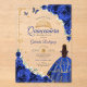 Royal blue gold Quinceanera celebration acrylic invitation. Features brunette girl in ball gown dress, script font, gold butterflies, roses and tiara. Perfect for an elegant princess style glam celebration. Personalize with your own details. Stylish transparent or frosted acrylic invitations.