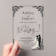 Cet élégant faire-part de mariage acrylique noir et blanc est parfait pour un mariage moderne. Le design simple présente une élégante calligraphie noire, un cadre noir chic et une illustration de mariée et de mariée sur un arrière - plan transparent et clair. La carte d'invitation comprend les détails du mariage au dos au lieu de payer une carte d'enceinte séparée.