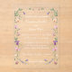 Célébrez votre journée spéciale avec la beauté intemporelle de notre Elegant Fleur sauvage Clear Acrylique Faire-part de mariage. Dotée d'une délicate bordure de fleurs sauvages peints à la main dans des roses douces, des violets et des verts, cette invitation transparente offre une façon unique et sophistiquée d'invitation à vos invités. Parfait pour les mariages de jardin, les fêtes de printemps ou les cérémonies romantiques en plein air, ce design allie élégance moderne et charme naturel. Customisez avec vos données personnelles pour créer un souvenir qui sera chéri pour toujours.