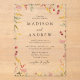 Élégantes invitations de mariage Fleur sauvage d'été avec vos noms et détails mariages en lettres noires classiques, encadrées par un beau tableau de fleurs d'aquarelle et de verdure dans les tons jaune doré, rose et violet. Conçues contre un arrière - plan acrylique élégant, ces fleurs sauvages d'aquarelle sont le choix idéal pour les mariages du printemps et de l'été. Personnalisez vos invitations de mariage pour refléter votre histoire d'amour unique avec ce design dynamique et d'inspiration nature.