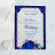 Cette élégante faire-part de mariage en acrylique bleu royal est dotée d'un arrière - plan métallique bleu et d'un cadre en or en fibre de bijoux combiné à de riches roses bleus pour un design de mariage élégant. Le texte bleu dans les polices formelles classiques peut être facilement personnalisé pour votre propre journée spéciale.