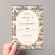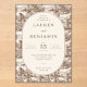 This elegant wedding invitation features a vintage-inspired design with an oval central panel set against a detailed background of repeating illustrations, including houses and trees. The sepia color palette enhances its classic and timeless feel, while the serif typography adds sophistication. Customizable text fields allow for personalization, making it perfect for formal celebrations. The layout is balanced and harmonious, ensuring both visual appeal and readability, ideal for conveying the joy and tradition of a wedding event.