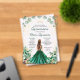 L'invitation présente un design élégant d'inspiration nature avec un cadre aquarelle de verdure et des accents floraux en vert et or. Au centre se trouve l'illustration d'une jeune femme dans une robe vert émeraude aux cheveux fluides ornée d'une couronne dorée. Le texte est coiffé d'un mélange de polices cursives et serif, avec des ornements dorés comme une couronne ajoutant une touche royale. La disposition est équilibrée, alliant sophistication et esthétique formelle gracieuse.