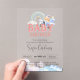 Présentant notre invitation de Baby shower de fille espagnole, mettant en vedette un doux ours en tourbe comme pilote d'un avion de charme, s'envolant à travers des ciels roses d'aquarelle douce avec un arc-en-ciel. Ce design enchanteur apporte un sentiment de chaleur et de familiarité à vos proches hispanophones, vous permettant d'ajouter une touche personnelle et élégante à votre célébration spéciale. Parfait pour accueillir une petite fille avec amour et joie !
