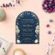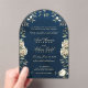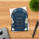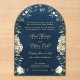An elegant and classic archway wedding invitation featuring a greenery lined archway with eucalyptus, ferns and white flowers, with text in classic wedding script and a minimalist non serif font for the details in white on a watercolor-wash navy blue background.