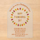 Cette incroyable invitation plexi Thanksgiving Party présente une image art numérique d'une série de feuilles de chêne dans les tons rouge, orange, jaune et vert disposés en cercle autour d'un texte avec des lettres alternées de rouge, jaune, orange et vert qui dit Bon thanksgiving Day. Il y a du texte personnalisé pour que vous puissiez personnaliser ce design avec tous les détails de la fête.