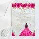 Cette invitation à la fête d'anniversaire élégante et séduisante présente une belle princesse aux cheveux foncés et à la peau foncée dans une robe de bal rose chaud. Le texte combine écriture manuscrite et polices sans serif modernes pour un look élégant et sophistiqué. Les compositions florales, les papillons et les confettis d'or créent un mélange parfait de rustique et de chic. Graphiques par www.etsy.com/uk/shop/SunflowerDayLove