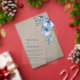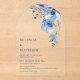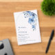 Cette élégante invitation de mariage contemporaine présente des fleurs bleues peintes à l'aquarelle sur fond blanc.