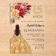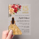 Une invitation moderne, élégante et glamour pour une Quinceañera, 15ème anniversaire. Un arrière - plan transparent, une fille portant une robe dorée et des roses rouges, roses et dorés, des fleurs. Le nom est écrit avec un script de style moderne écrit à la main. Personnalisez et ajoutez les détails de votre fête.