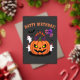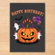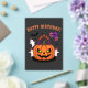 Gâteau d'anniversaire citrouille de dessin animé avec ballons crâniens, fantômes en casquettes de fête, bougies déplaisantes et chauves-souris pour un anniversaire éffrayant d'Halloween.
