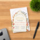 The text is inside a faux gold arch frame that has a faux gold cross on top and it is surrounded of both sides by wildflowers painted in watercolor. The wildflowers are pink, red, blue and orange colored. The occasion is written in a red script; the date is also red. The info is on two columns, separated by a faux gold line. The background of the text is ivory, almost white. The background of the flowers is transparent.