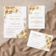 This elegant luxury wedding invitation features 3 dimensional gold flowers and golden line art flowers on a transparent background. Bride and groom names in an elegant classic script.