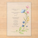Élégant et chic, ce faire-part de mariage acrylique transparent et dépoli d'inspiration boho présente des fleurs sauvages d'aquarelle vibrants dans des tons rustiques et colorés. Parfait pour une fête de printemps, il combine un script de calligraphie moderne avec un design floral pour une invitation unique et élégante qui donne le ton pour votre journée spéciale.