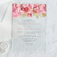 Cette faire-part de mariage romantique à fleurs est entourée d'une bordure supérieure fleurie rose et or. Les noms du couple apparaissent dans la police serif rose classique, avec le texte restant dans sans serif, sur un arrière - plan transparent clair.