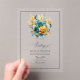 Faites une déclaration avec cette élégante faire-part de mariage acrylique transparente avec de magnifiques accents floraux turquoises et or. La typographie sophistiquée et le style in-situ en texture bois créent un équilibre parfait entre luxe moderne et charme rustique. Entièrement personnalisable, cette invitation est idéale pour les mariages chics et élégants avec une palette de couleurs audacieuses.