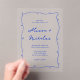 Faites de vos invités de mariage se démarquer avec nos Invitations Acryliques Mariages Bleues Frappées à la Main Lumineuse Moderne. Dotées d'une base en acrylique claire ornée d'une charmante bordure bleue dessinée à la main, ces invitations mêlent élégance moderne et touche de flair artistique. Les accents bleus vibrants créent un look frais et accueillant, parfait pour les couples qui veulent une introduction élégante mais unique à leur journée spéciale.