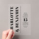 Avec son texte vertical épuré et son design minimaliste, cette invitation de mariage audacieuse dégage une élégance moderne. Son esthétique contemporaine met en valeur des lignes nettes et une typographie soignée, ce qui en fait le choix idéal pour les couples recherchant une annonce sophistiquée mais minimaliste. Ce design saisissant offre une touche moderne à la papeterie de mariage classique.