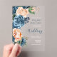 Une floraison de roses brillants et audacieux dans les tons bleu poussiéreux et pêche est le point de convergence de nombreuses pièces de cette suite mariage qui dispose également d'élégants textes de script et des dispositions de design moderne. Le faire-part de mariage acrylique transparent montré ici a une bordure latérale luxuriante de roses. Entrez facilement les détails de votre mariage à l'aide du modèle fourni. Cherchez ID584 pour voir toutes les pièces correspondantes dans ce bel ensemble de mariages.