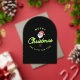 This image displays a "Merry Christmas and Happy New Year" greeting card with a striking and contrasting design. The deep black background highlights the word "Christmas," which is written large and bold in a bright, neon lime-green cursive style, accompanied by an illustration of a smiling Santa Claus head at the top. The overall design has a modern and festive feel, with essential red and green color accents for the celebration.