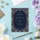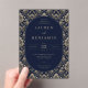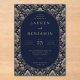 This is a classic style image featuring an elegant wedding invitation with intricate gold floral patterns on a navy blue background. The design exudes sophistication and timeless charm, making it perfect for a formal celebration. The text is centered within an oval frame, highlighting the names "Lauren and Benjamin" along with the details of their special day. It's ideal for couples who want to convey a sense of luxury and grace at their wedding event.