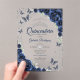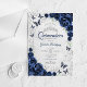 Navy silver and white Quinceanera celebration invitation. Features script font, silver butterflies, watercolor roses and tiara. Perfect for an elegant princess style glam celebration. Personalize with your own details. Stylish transparent or frosted acrylic invitations.