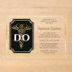 "DO" et un caducée doré sur un panneau de cadre à coquilles noires sur la gauche avec vos détails sur la droite, le tout entouré d'un cadre à double coquillage couleur or sur un design d'invitation claire arrière - plan graduation qui peut être personnalisée pour les médecins des diplômes de médecine ostéopathique. Conception composite par Holiday Hearts Designs (droits réservés).